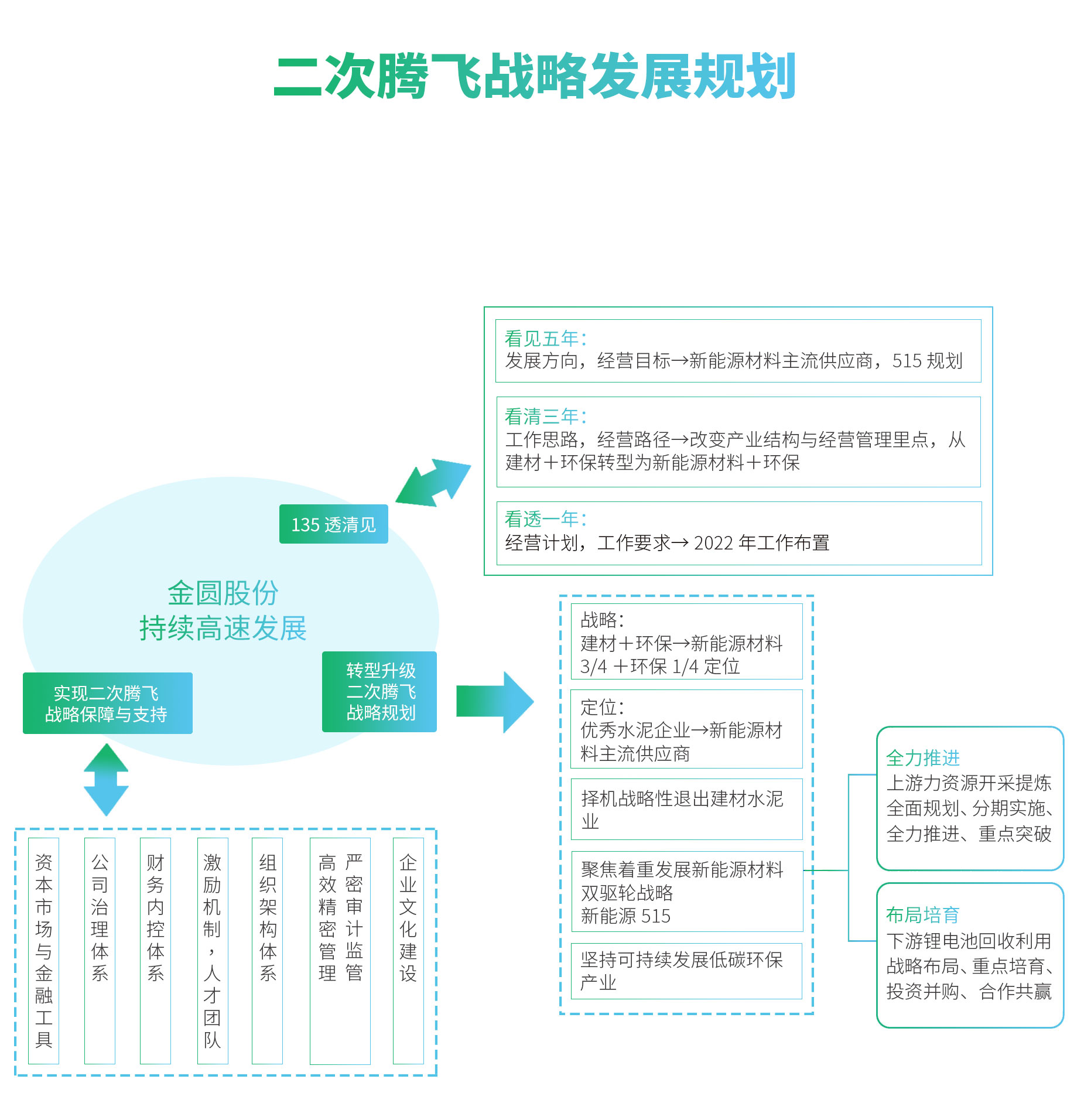 金圓將通過“二次騰飛”戰(zhàn)略實(shí)施,躋身成為中國乃至全球領(lǐng)先的集上游鋰資源開采提煉、下游廢舊鋰電池與固危廢資源化處置及稀貴金屬綜合回收利用為一體的新能源材料主流供應(yīng)商。
