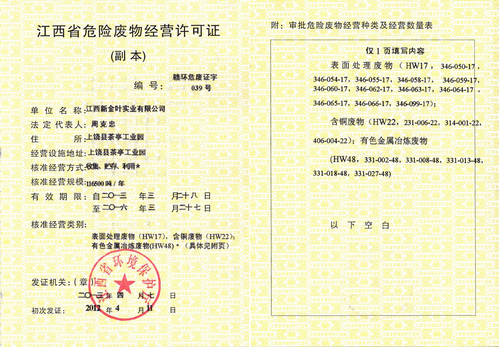 2013年3月取得江西省環(huán)保廳頒發(fā)的“危險(xiǎn)廢物經(jīng)營(yíng)許可證”。