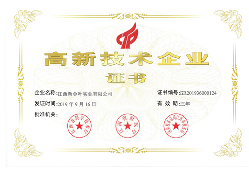 新金葉公司全資控股的江西匯盈環(huán)??萍加邢薰境闪⒂?017年,為江西省綜合資源再生利用最大規(guī)模企業(yè)之一,公司現(xiàn)有15項(xiàng)國(guó)家認(rèn)定實(shí)用新型專利,2019年9月獲得國(guó)家高新技術(shù)企業(yè)證書。