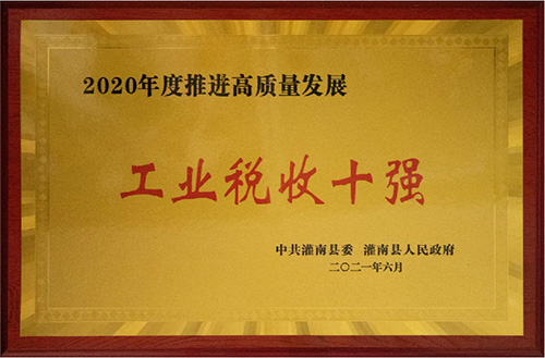 灌南金圓環(huán)??萍加邢薰精@得中國(guó)輕工業(yè)投資發(fā)展協(xié)會(huì)授予的全國(guó)科技創(chuàng)新示范單位稱號(hào)及灌南縣政府頒發(fā)的2020年度稅收十強(qiáng)單位榮譽(yù)